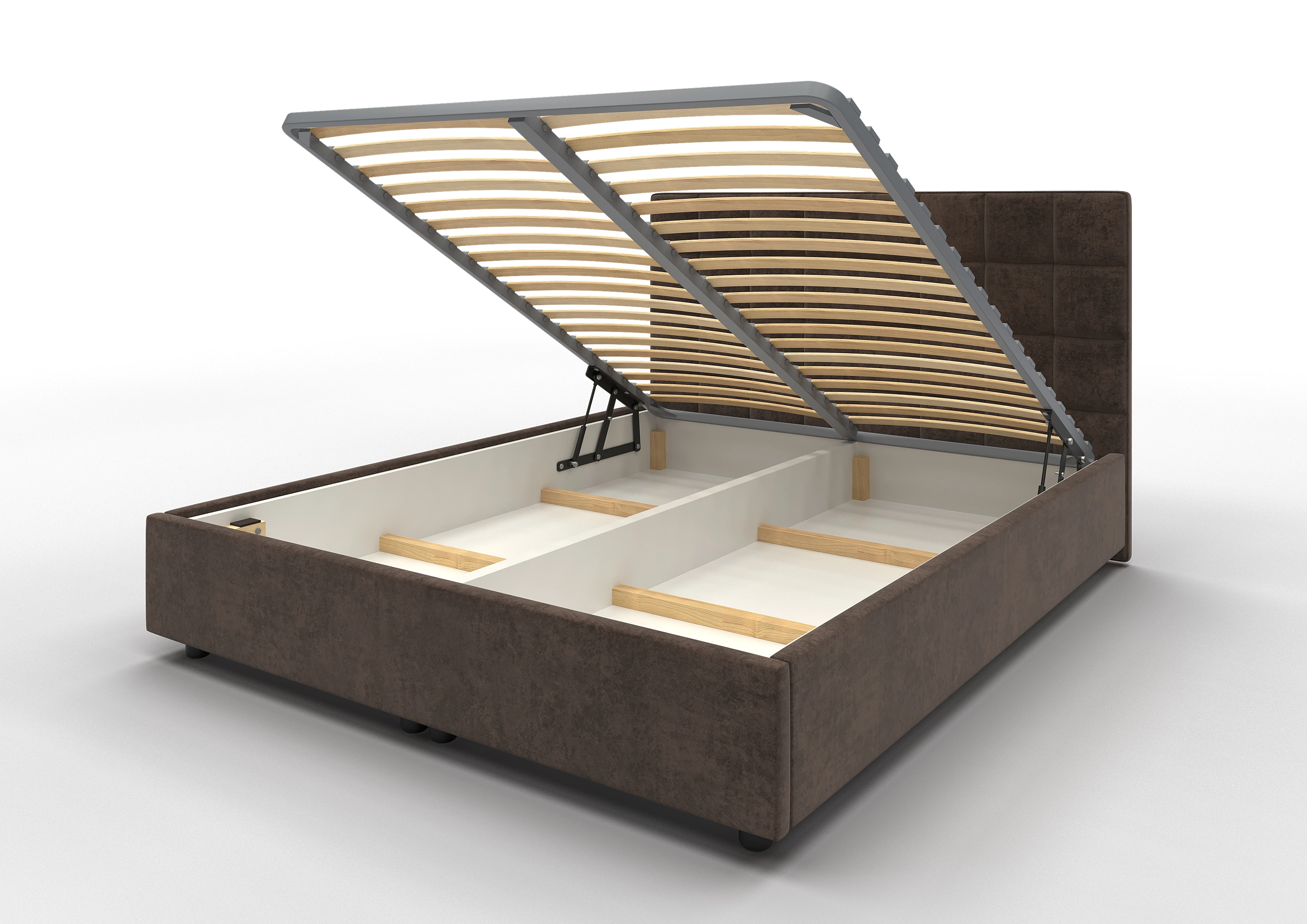 pe un cadru metalic cu lamele late flexibile din mesteacăn stratificat,care oferă posibilitatea organizării unui spațiu de depozitare
