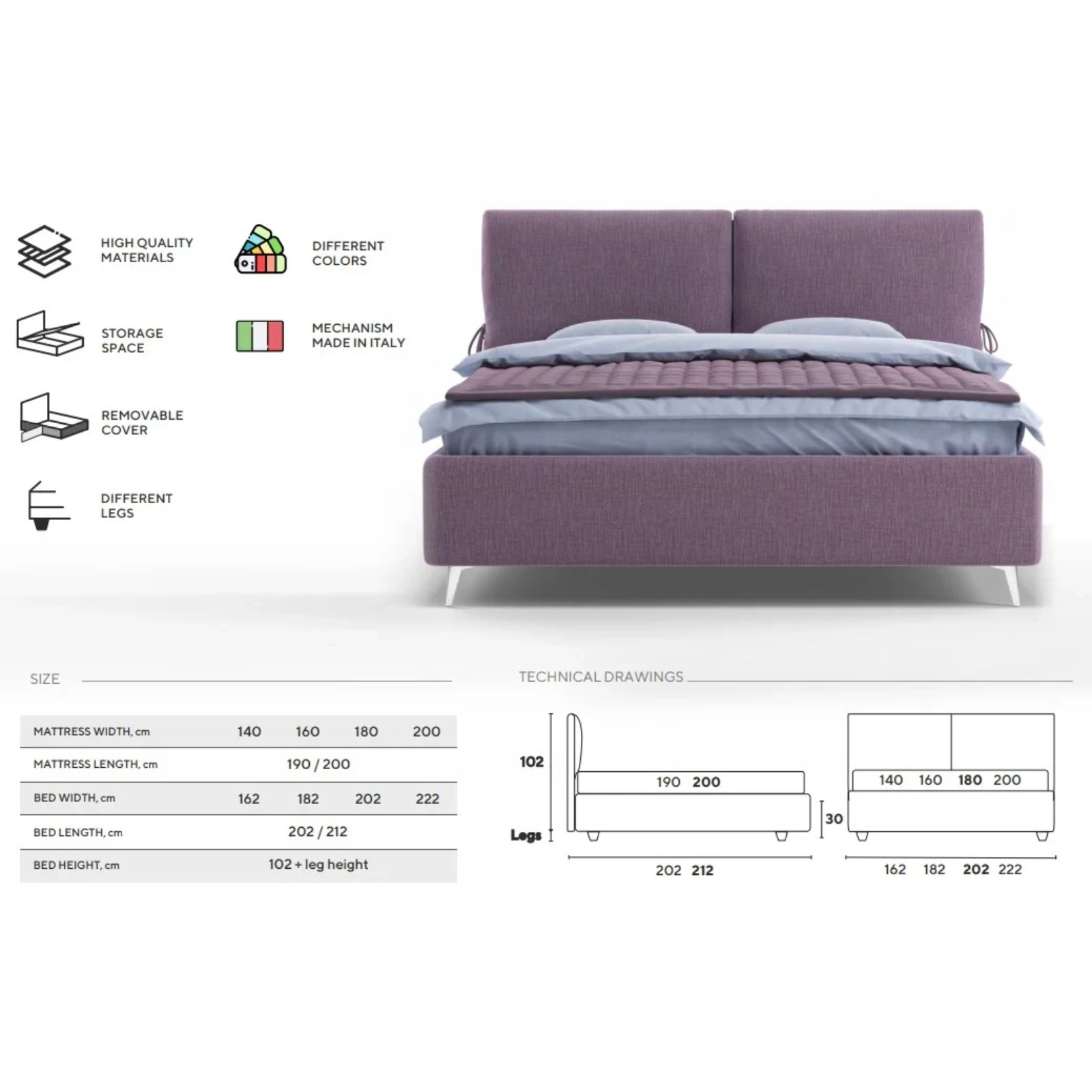 • Patul vine cu picioare standard Chrome de 5/8/10 cm (cilindrice din metal argintiu). Alte optiuni sunt contra cost.