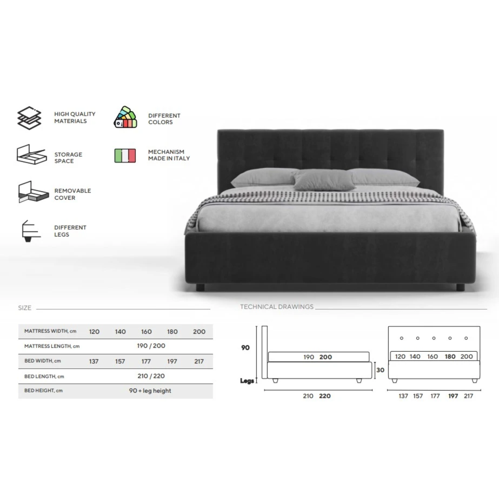 Lungime 190/200 - Adâncimea utilă a spațiului de depozitare: 15 cm;
