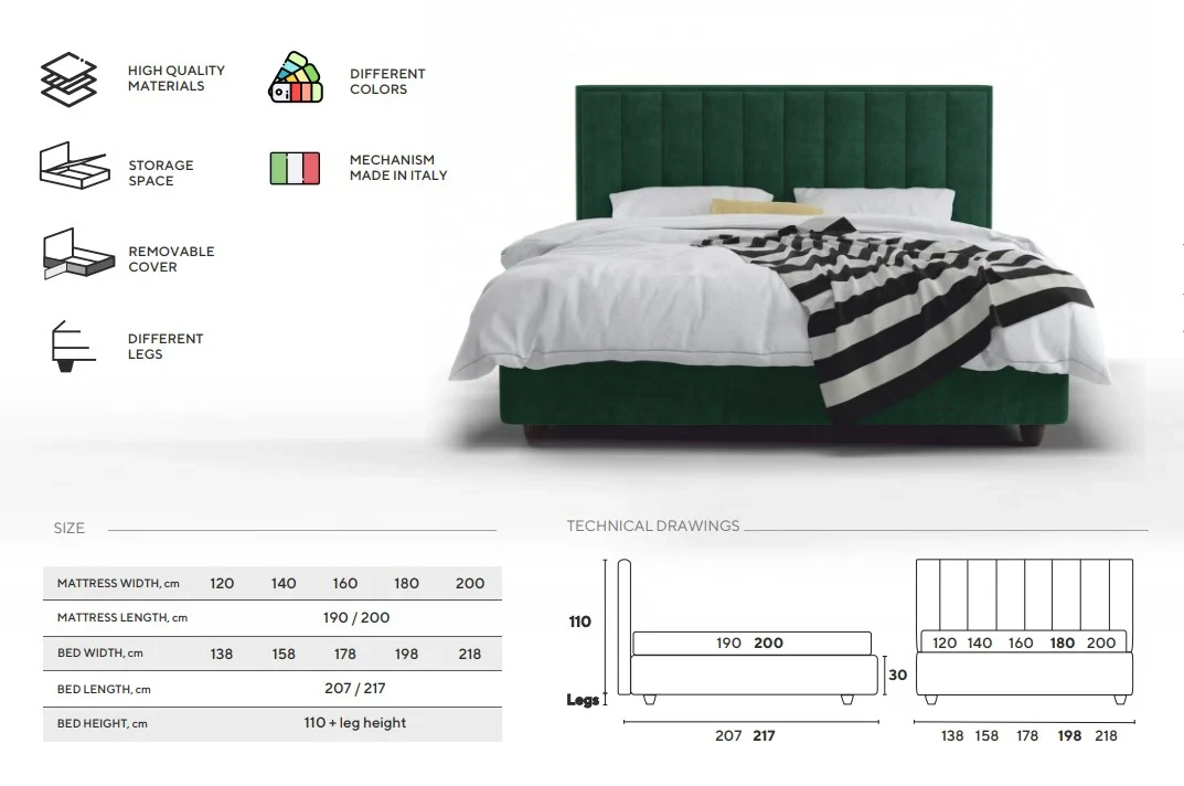 Patul vine cu picioare standard Chrome de 5/8/10 cm (cilindrice din metal argintiu). Alte optiuni sunt contra cost.
