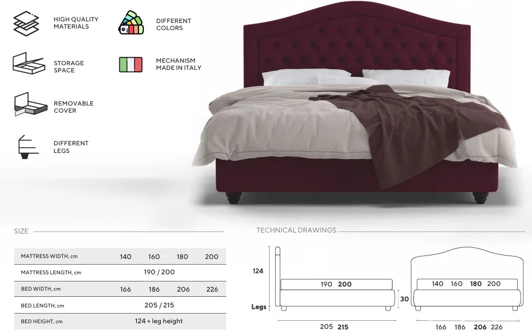 Patul vine cu picioare standard Chrome de 5/8/10 cm (cilindrice din metal argintiu). Alte optiuni sunt contra cost.