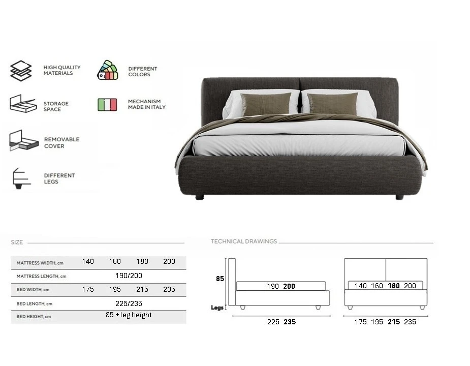 Patul vine cu picioare standard Chrome de 5/8/10 cm (cilindrice din metal argintiu). Alte optiuni sunt contra cost.
