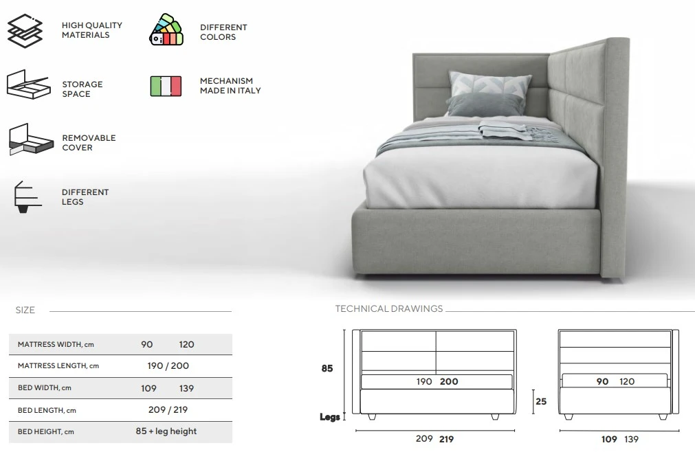 Patul vine cu picioare standard Chrome de 5/8/10 cm (cilindrice din metal argintiu). Alte optiuni sunt contra cost.