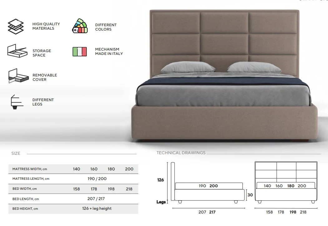 Patul vine cu picioare standard Chrome de 5/8/10 cm (cilindrice din metal argintiu). Alte optiuni sunt contra cost.
