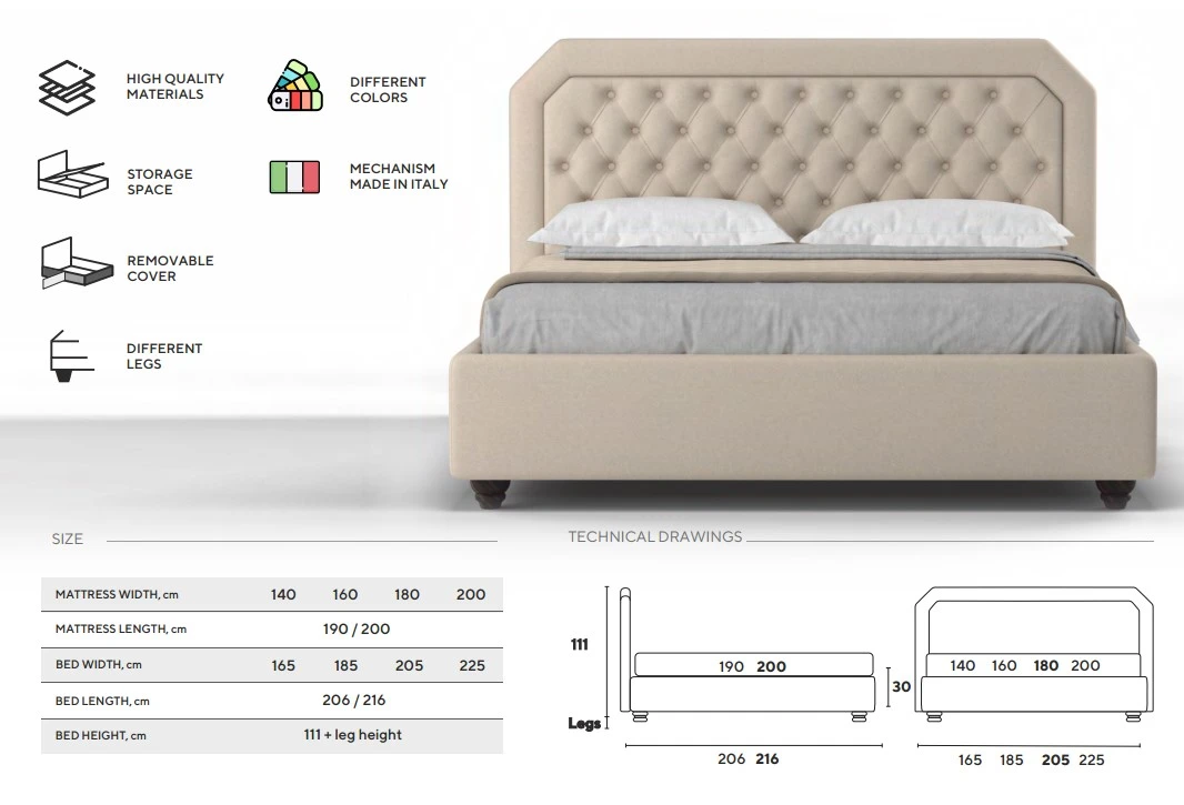 Patul vine cu picioare standard Chrome de 5/8/10 cm (cilindrice din metal argintiu). Alte optiuni sunt contra cost.