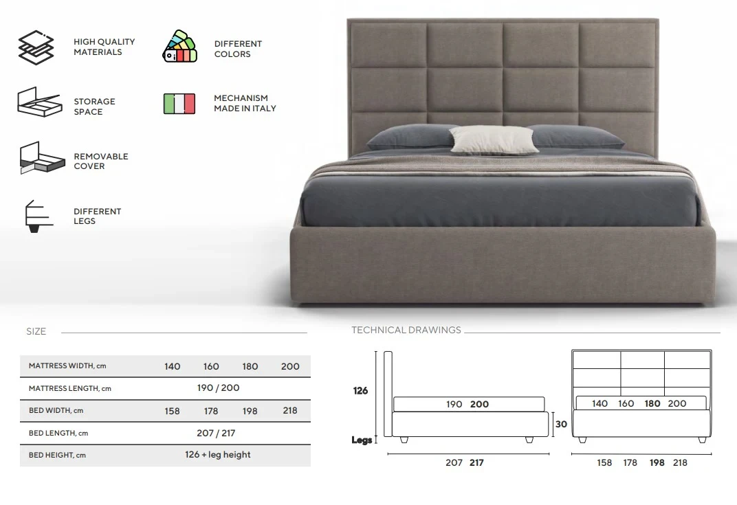 Patul vine cu picioare standard Chrome de 5/8/10 cm (cilindrice din metal argintiu). Alte optiuni sunt contra cost.