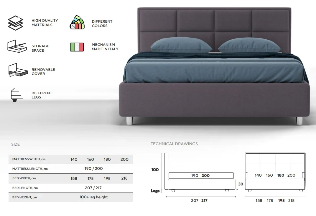 Patul Sienna este caracterizat de un design modern și elegant, având o tăblie cu linii drepte și fine. Tăblia conferă un aspect minimalist, iar liniile curate adaugă un aer sofisticat și contemporan. Fabricat din materiale de calitate, acest pat se integrează perfect într-un decor modern, fiind atât confortabil, cât și estetic plăcut.