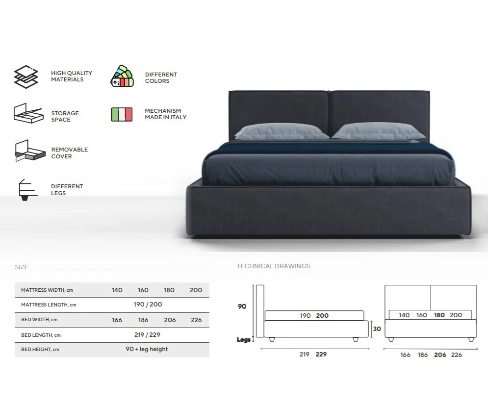 Patul vine cu picioare standard Chrome de 5/8/10 cm (cilindrice din metal argintiu). Alte optiuni sunt contra cost.