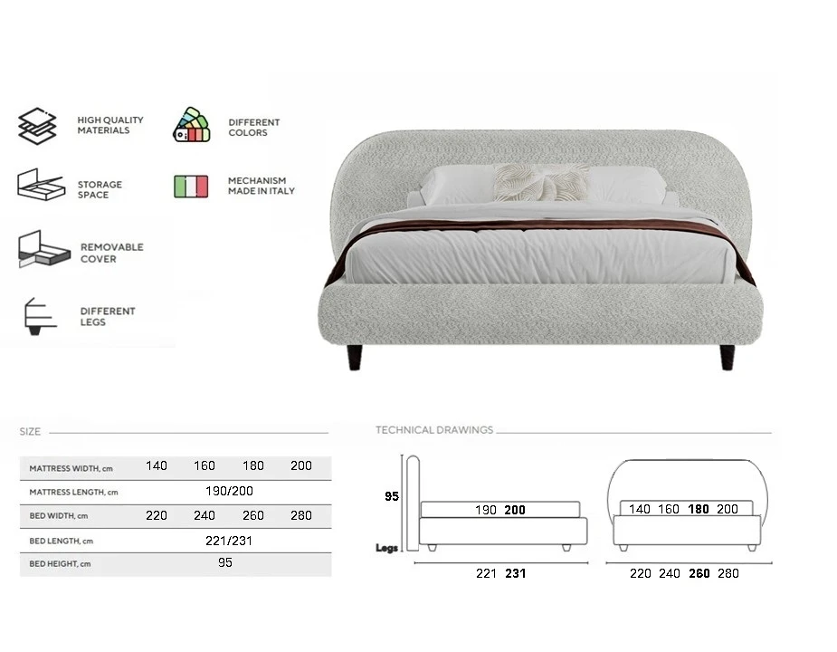 Patul vine cu picioare standard Chrome de 5/8/10 cm (cilindrice din metal argintiu). Alte optiuni sunt contra cost.