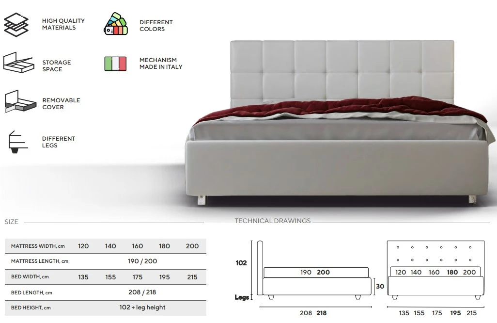 Patul vine cu picioare standard Chrome de 5/8/10 cm (cilindrice din metal argintiu). Alte optiuni sunt contra cost.
