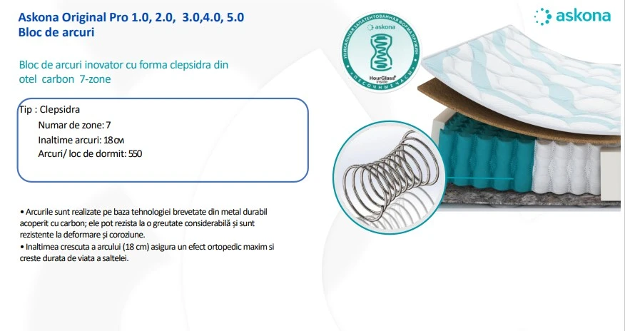 Formulă unică cu arcuri "Hour Glass Carbon 180 7-zone"- permite saltelei să reziste de 10 ori mai multă sarcină de greutate.